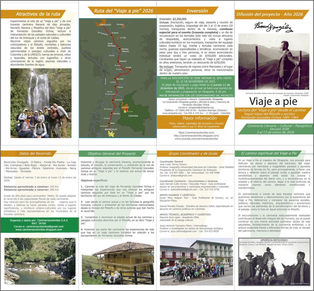 Rescatamos promovemos itinerarios culturales y proyectos de camineria literaria en nuestro país, nuestra ruta estrella es e proyecto Lectura de “Viaje a pie” desde el camino según el filósofo Fernando Gonzáez Ochoa, ya son más de 700 viajeros a pie que nos han acompañado en este sueño viajero-literario, paisajístico y cultural. Muchas otras rutas de importantes escritores como Tomás Carrasquilla, Manuel Mejía Vallejo, Gabriel García Márquez, estamos constantemente realizándolas.